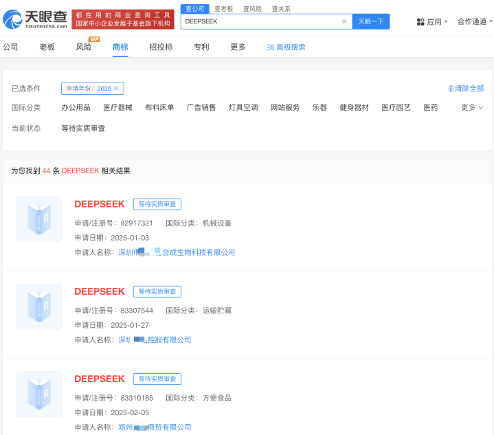 天眼查App显示,“DeepSeek”关联公司杭州深度求索人工智能基础技术研究有限公司成立于2023年7月,法定代表人为裴湉,注册资本1000万人民币,经营范围包括信息系统集成服务、人工智能应用软件开发、信息技术咨询服务等,由梁文锋及其名下宁波程恩企业管理咨询合伙企业(有限合伙)共同持股。知识产权信息显示,该公司已成功注册多枚“DEEPSEEK”商标,最早申请日期为2023年11月。除该公司外,已有多家企业于近期申请注册多枚“DEEPSEEK”商标。